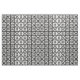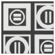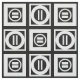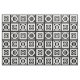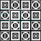 Stylish geometric fabric features white squares with space between them on a black background. The diagonally opposed thick squares each contain a thin white circle with a thick equal sign inside. In contrast, the thin squares each contain a thick white circle that touches the square’s edges with a thin vertical equal sign inside.