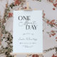 Minimalist wedding rehearsal dinner welcome sign featuring typography text that says "one more day." The background is white.