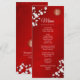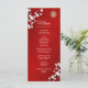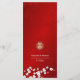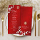 White oriental blossoms and a gold double happiness symbol on a shimmering red background. With custom bride and groom names, the wedding date and a custom menu text. On the backside are the initials to change.
