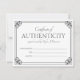 Elegant certificate of authenticity flat card in dark gray and white to which you can add your name or business name inside an ornate vintage-inspired frame. White certificate of authenticity flat card with elegant frames and fonts.
