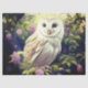 Gift tissue/decoupage paper with image of a beautiful white owl in a tree with beautiful purple flowers. “Owls are silent witnesses of the moon’s mysteries, perched upon branches of cosmic wonder.”