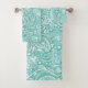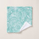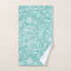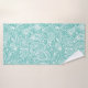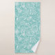 The white vintage floral paisley pattern over a turquoise-blue color background.