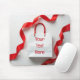 A plain white gift bag sits centrally on a light background, its vibrant red ribbon gracefully flowing around it, adding an elegant touch.