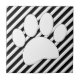 White version of the paw print decorative ceramic tile. Black and white stripes in the background. Original drawing. Gift idea for dog lovers.