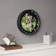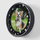 Round wall clock you can personalize with a photo of your pet with roman numbers and lots of little paw prints against a black background.