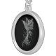 a decorative white lineart design of a phoenix bird taking off on a black silver plated necklace
