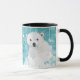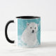 This pretty winter mug features a beautiful white polar bear against a blue sky with white snowflakes. Fluffy white clouds surround the bear at the bottom. The image is printed on two sides of the mug, with darker teal script at the middle that says "Believe in the Magic". Your name or other text is at the bottom.
