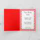A custom folded party invitation with italic and block letters on white polka-dots on a red background. Or customize this design to change fonts, sizing, add or remove text and more.