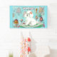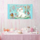 Sweet white poodle sitting among fancy cakes, a cupcake and desserts. Flourishes and birdies also in background. Background is aqua and colors are fun and bright. Great for a birthday party!