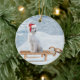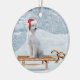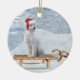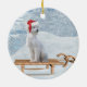 White poodle outside in a snowy background and wearing a Santa hat sits on a sled waiting for a push cute dog lovers Christmas ornament