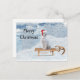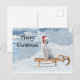 White Poodle sits on an old fashioned sled in the snow wearing a Santa hat dog lovers Christmas holiday postcard