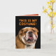 Cute English Bulldog claiming that this IS his costume. The proof is the inside photo, he's actually a foo-foo poodle! Or whatever breed you want to change it to (replace the poodle photo with your own pet)! Which ever breed this dog is, he/she deserve treats! Fun Halloween card for dog lovers.