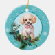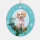 On the front of this Holiday ornament is a beautiful portrait of a white Poodle dog framed within a holly and evergreen bough. Red berries and pine cones decorate the holly and pine sprigs. The image is placed on a pale blue circle framed by a retro blue snowflake pattern. The back of the ornament has the same background and circle with your custom text in blue.