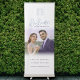 Wedding welcome entry banner with silver gray and deep purple text and monogram around a soft white bordered photo. Heart crown crest entwined with leaves and berries monogram line art, personalize with your own photo, monogram initials, couple's name and wedding date. Uniquely designed and hand drawn by Sarah Trett for www.mylittleedenweddings.com on Zazzle.