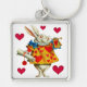 Large square premium metal keychain with a vintage Alice in Wonderland image of the White Rabbit in full regalia amid whimsical red hearts. See the entire Wonderland Keychain collection in the PARTY FAVORS section.