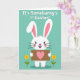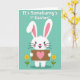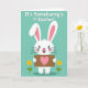 The front design shows a bright turquoise background setting a springtime scene, with a white bunny centered and facing forward 🐰. Its long ears have soft pink inner shading, and its simple black eyes and open smile give it a sweet, friendly look. The bunny holds a small brown rectangle sign close to its chest, like it’s offering it to someone special with a gentle, affectionate posture. A large pink heart sits in the middle of the sign, turning the moment into a quiet, romantic or best-friends kind of gesture. Near the bottom, two small yellow flowers with green stems rest at the bunny’s feet, adding a fresh seasonal touch 🌷. Across the top, a short holiday message appears in white letters, spaced clearly above the bunny’s ears. The heart is a strong rosy pink against the brown sign, and the flowers are a sunny yellow with simple green stems. The bunny’s thin whiskers extend from each cheek, and the pink heart on the sign is centered and easy to spot.