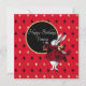 Festive birthday greeting features vintage illustration of the White Rabbit in red tinted Queen of Hearts garb with black and gold customizable text circle and red / gold / black diamond background