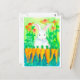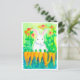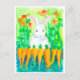 A pretty post card for Easter or any day to say hello featuring a white rabbit in a garden with bright orange carrots and wildflowers painted in colorful shades of watercolor.