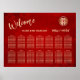 This traditional Chinese wedding seating chart features a gold double happiness symbol and a welcome text in an elegant handwritten script on shimmering floral red background.