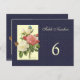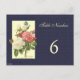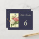 A custom Table Number postcard with script letters and pinkish red and white botanical roses on a dark blue faux linen background Click Customize It to change fonts, sizing and more, even save your design for later.