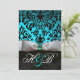 WHITE RIBBON TEAL AQUA BLUE BLACK DAMASK MONOGRAM INVITATION