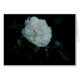 A photograph of a single white rose blossom among the darkness of the leaf foliage.
