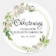 Two gold rings anchor this design. White roses nestled in greenery are placed around the rings. Christening is written in an elegant flowing script. The baby's name is written in a classic serif font and the date follows. Perfect for either a boy or girl.