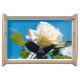 White rose under blue sky. Vibrant photo of a beautiful blooming rose makes a great floral wall art gift. The calm beauty of white rose reflects new beginnings, purity,loyalty and innocence. White roses symbolize the young love that the bride has for her spouse. White roses also symbolize the foundation of a relationship, which is why they are often seen on a wedding day. The white rose is a traditional wedding flower. White rose is a fitting flower for celebrating a new romantic and marital bond.