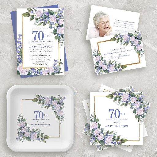 White Rose Blue Floral Custom 70th Birthday Party Paper Plates