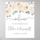 Elegant white roses are nestled in soft sage green leaves. Welcome is written in a trendy script font. The wedding couple names are also in a popular script font. The soft gray text complements the neutral floral palette. This wedding welcome sign is part of the White Rose Botanical collection. If you need more matching items, please message me. My name is Nelda and I am happy to help!