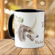 Behind this beautiful watercolor portrait of a Borzoi Dog on this mug is a pretty white rose bouquet. The bouquet and dog image are have an overlay swirl of faux glitter confetti. The image is printed on two sides, with your custom text in black at the center bottom between the images. Perfect for anyone who has lost their heart to a Borzoi hound. *Please note - the image is printed and does not contain actual glitter.