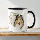 Behind the beautiful watercolor portrait of a Collie dog on this mug is a pretty white rose bouquet. The bouquet and dog image are against an overlay swirl of faux glitter confetti. The image is printed on two sides, with your custom text at the center bottom between the images.