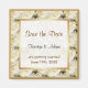 Subtle and elegant in gold edged damask, with a lovely profusion of white roses the border. Customize with your wedding information.