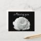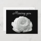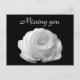 "Missing you" postcard featuring a beautiful picture of a single white rose on a black background. To find other items containing this image visit Zazzle's Photo_Genesis store.