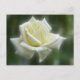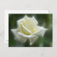 This is a stunning photograph. A white rose in perfect bloom. The soft white aura that surrounds it and the unfocused background evoke softer feelings and a sense of calm. The outer petals with dew drops are fully open, yet no matter where you look on the rose, your eye is drawn to the tight circle of petals that are yet to unfold. And there you find the yellow inner glow. A wonderfully compelling and evocative photograph.