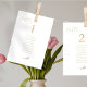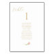 Elegant, fresh and modern. This simple and elegant table number card with guestlist features a whimsical line drawn blush pink rose and a contemporary set of fonts in a faux gold, against a crisp white background. The front design is repeated at the back for better table visibility. Alternatively mount the full set of cards together on a display board. This design includes 10 names, however 12 names (max) still fits.