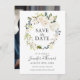 Send out lovely wedding save the date cards with a delicate white watercolor floral wreath of roses, hydrangeas, mixed blooms and trailing greenery. A trendy hand-written type face spells out the names of the bride and groom beautifully. The back of the card has a photo template for uploading your desired photo.
