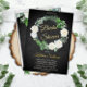 Beautiful watercolor white roses Bridal Shower wreath design with lovely eucalyptus and fern greenery in shades from dusky sage to vibrant green real gold foil editable script text on a smokey black aged and textured look background. All text other than gold foil text is in a creamy off-white. The theme is continued on back with a top and bottom floral and greenery swags on a smokey black aged and textured look background. Composite design by Holiday Hearts Designs.