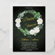 Beautiful watercolor white roses Bridal Shower wreath design with lovely eucalyptus and fern greenery in shades from dusky sage to vibrant green real gold foil editable script text on a dark green aged and textured look background. All text other than gold foil text is in a creamy off-white. The theme is continued on back with a top and bottom floral and greenery swags on a dark green aged and textured look background. Composite design by Holiday Hearts Designs.
