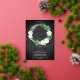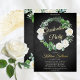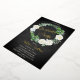 Beautiful watercolor white roses Graduation Party wreath design with lovely eucalyptus and fern greenery in shades from dusky sage to vibrant green real gold foil editable script text on a dark smokey black aged and textured look background. All text other than gold foil text is in a creamy off-white. The theme is continued on back with a top and bottom floral and greenery swags on a dark smokey black aged and textured look background. Composite design by Holiday Hearts Designs.