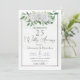 Elegant 25th Wedding Anniversary Invitation featuring a watercolor illustration of seeded eucalyptus leaves, white roses and baby breaths little flowers.