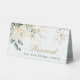 Elegant place card featuring an illustration of white roses, greenery foliage and golden floral in watercolor style.