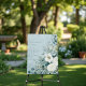 White Roses Hellebores Silver Eucalyptus floral wedding welcome sign featuring elegant calligraphy script modern watercolor flowers frosty pale blue background and snowflake details