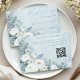 White Roses Hellebores Silver Eucalyptus floral wedding RSVP card featuring elegant calligraphy script modern watercolor flowers frosty pale blue background and QR code