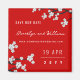 An original illustration of beautiful white cherry blossoms or sakura spring flowers with black branches on a classic red background. This is a modern save the date announcement magnet.