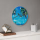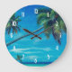 A clock with a tropical themed photo featuring coconut palms stretching out across a white sandy beach. Turquoise waters and an azure blue sky in the background.