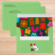 White Santa Elephant on the back bottom of the envelope. A Christmas gift pattern on the inside. Personalize the front of the envelope with your address. Choose your color of the envelope. Edit this for more changes.