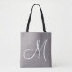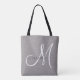 Personalized black and white monogrammed stylish tote bag with a script font design on a printed faux gray linen photo effect background. Trendy typographic style.