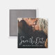 This simple, stylish modern photo wedding save the date magnet template features 'Save the Date' in a lively modern script with your first names and date on a single line below it. The text is a crisp white. We also offer a similar design in our shop that includes your wedding location city, so please check our store for that version if you prefer to include that info. Add your favorite photo and your details to make this simply chic photo wedding save the date magnet uniquely yours!