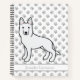 Destei's original cartoon illustration of a cute White Shepherd / White Swiss Shepherd / white coat color German Shepherd breed dog. There is also a personalizable text area for the title of the notebook. The background has a pattern of gray dog paw prints.